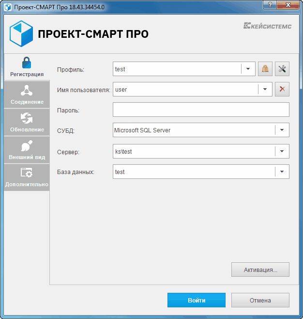 При последующих запусках комплекса на окне регистрации необходимо выбрать существующий профиль базы данных из раскрывающегося списка и пароль.