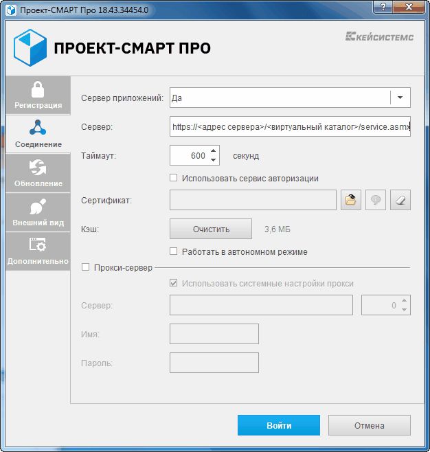 Сервер – адрес сервера приложений в виде https://<адрес сервера>/<виртуальный каталог>/service.asmx.