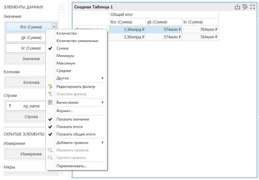Для каждого из элементов данных доступен свой набор возможных настроек, перейти к которым можно с помощью контекстного меню элемента. Подробнее свойства описаны в п. Свойства элементов данных.