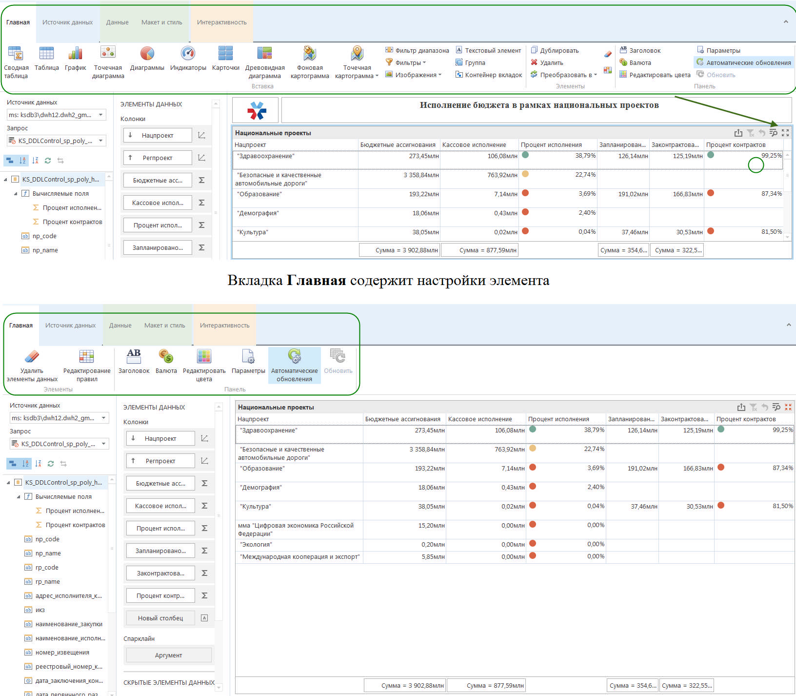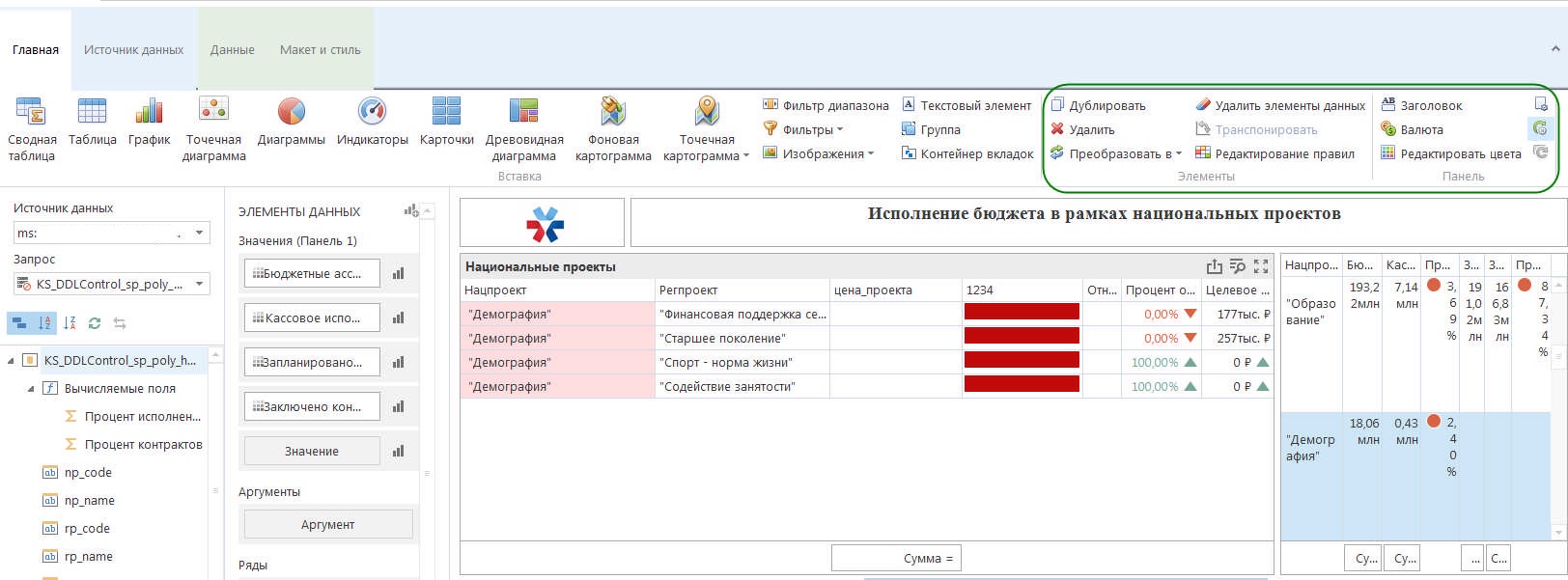 Для всех элементов визуализии доступны общие настройки, представленные во вкладке Главная в областях Элементы и Панель.