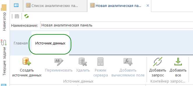 Работа над аналитической панелью начинается с создания источника данных. Для этого переходим на вкладку Источник данных. Источник данных создается в рамках данной аналитической панели. В него можно добавлять несколько различных запросов из разных контейнеров.В рамках одной аналитической панели можно создать несколько источников данных. Создание источников данных описано в разделе Источник данных. Для источника данных и запросов в нем, доступны действия по их редактированию.