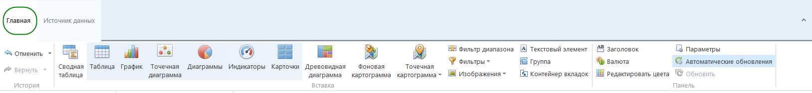 После создания и добавления всех необходимых источников данных переходим на вкладку Главная для визуализации данных. Все доступные средства визуализации представлены на панели инструментов. Для того чтобы добавить в дашборд какой-либо элемент, необходимо кликнуть по нему на панели инструментов. После добавления элемента следует приступить к его настройке.