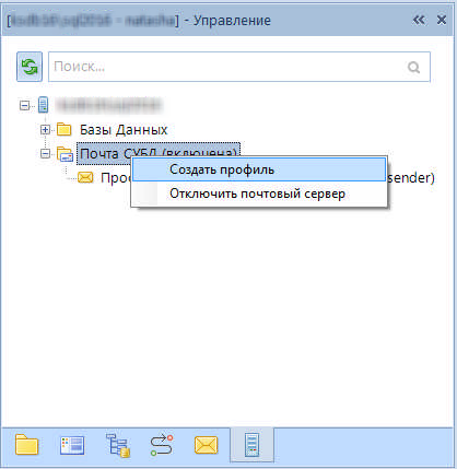 После запуска данного режима необходимо выбрать сервер баз данных и подключиться к нему под учетной записью системного администратора. В открывшемся окне в дереве сервера необходимо найти элемент «Почта СУБД» и через контекстное меню создать профиль.