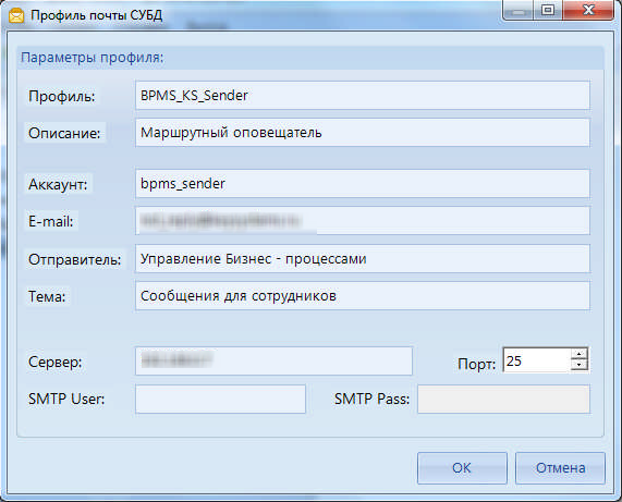 В открывшемся окне необходимо ввести параметры профиля почты СУБД: