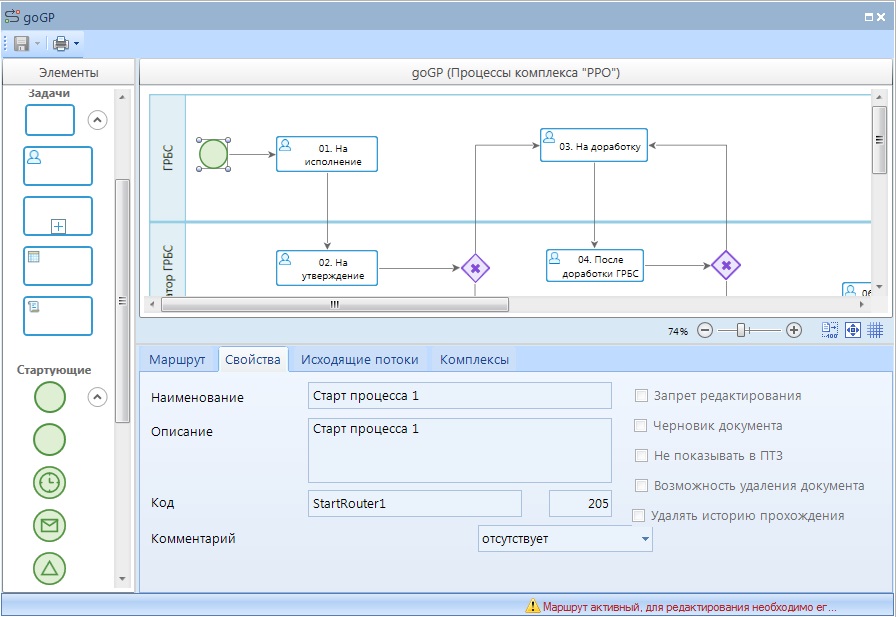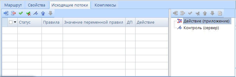 На вкладке Исходящие потоки указывается статус (доступно добавление только одного статуса), который присваиваются потоку в момент запуска процесса, с которым могут быть связаны определенные действия и контроли. Если статус на данной вкладке не указан, то по умолчанию каждому потоку операций будет присваиваться статус «Начало маршрута».