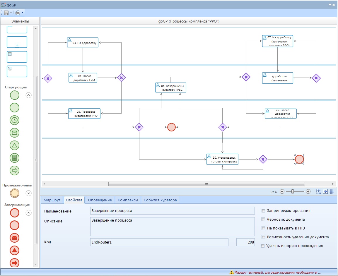 При выделении на схеме элемента «Завершающее событие» внизу окна редактирования становятся доступны его параметры, сгруппированные по вкладкам.