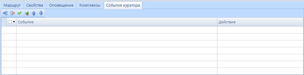 Вкладка События куратора содержит информацию по дополнительным действиям, которые будут выполняться при осуществлении принудительного завершения маршрута куратором. При добавлении новой строки в колонке Событие указывается кураторское действие «Завершение маршрута», в колонке Действие указывается необходимое для выполнения действие из справочника «Действия (сервер)» (подробнее в разделе Действия (сервер)).