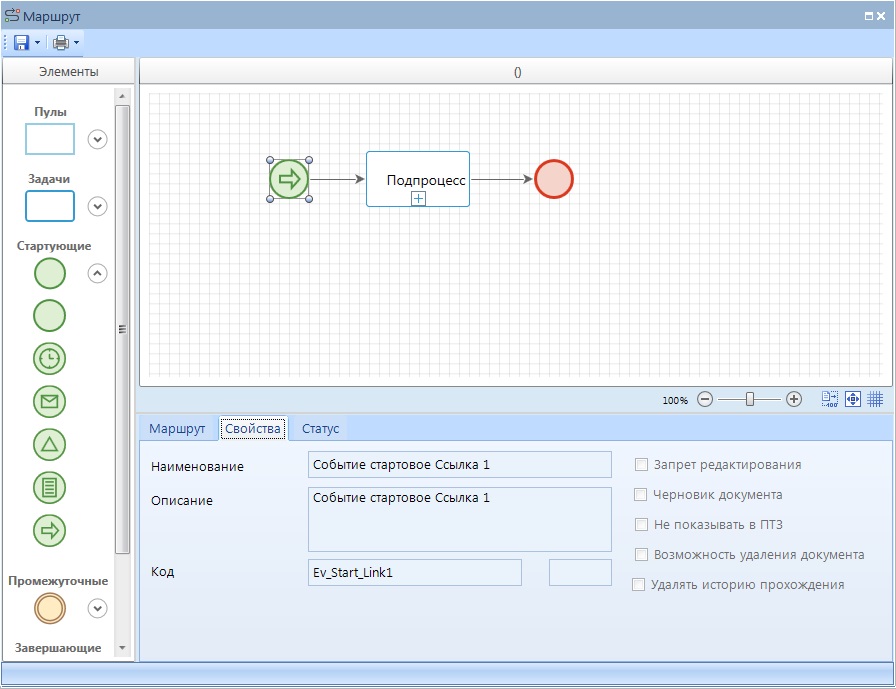 При выделении элемента «Стартовое событие-ссылка» на схеме внизу окна редактирования становятся доступны его параметры, сгруппированные по вкладкам.