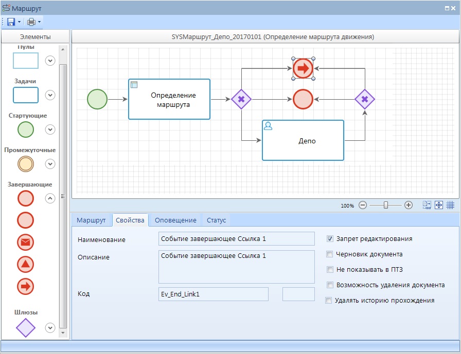 При выделении на схеме элемента «Завершающее событие-ссылка» внизу окна редактирования становятся доступны его параметры, сгруппированные по вкладкам.