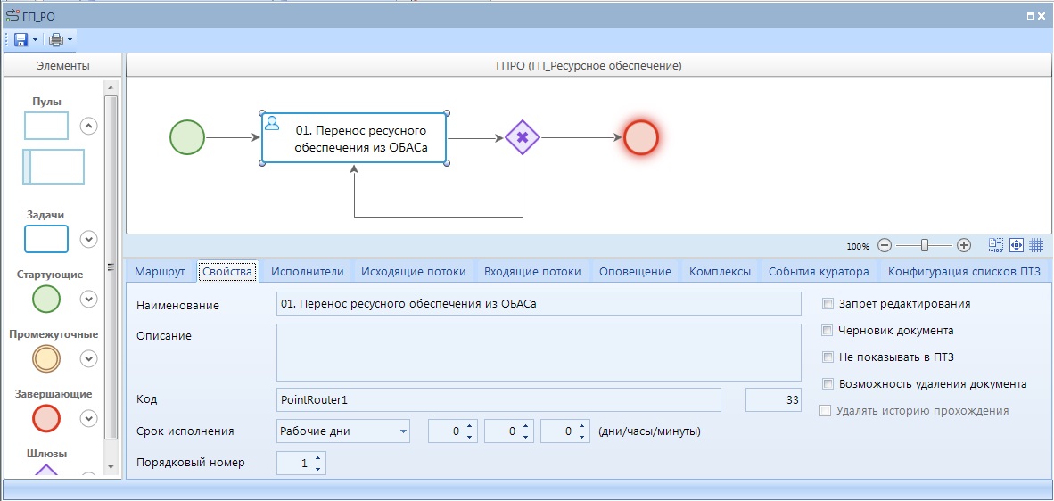 При выделении задачи на схеме внизу окна редактирования становятся доступны её параметры, сгруппированные по вкладкам Свойства, Исполнители, Исходящие потоки, Входящие потоки, Оповещения, Комплексы, События куратора, Конфигурация списков ПТЗ.