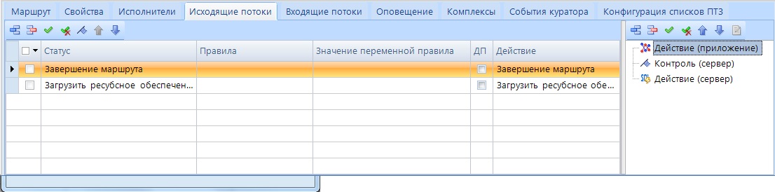 На вкладке Исходящие потоки указываются статусы исполнения задачи, которые однозначно определяют результат обработки документа на текущем этапе и дальнейшее направление его движения по маршруту. С каждым статусом могут быть связаны определенные действия и контроли.