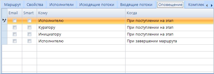 Вкладка Оповещение содержит варианты оповещения участников маршрута о поступлении документов на этап обработки.