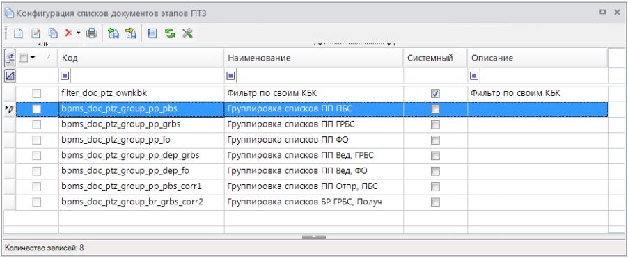 Справочник Фильтр документов этапов ПТЗ содержит список программных модулей, предназначенных для модификации списков документов в ПТЗ (подробнее в разделе Панель текущих задач), например, для их представления в сгруппированном виде.