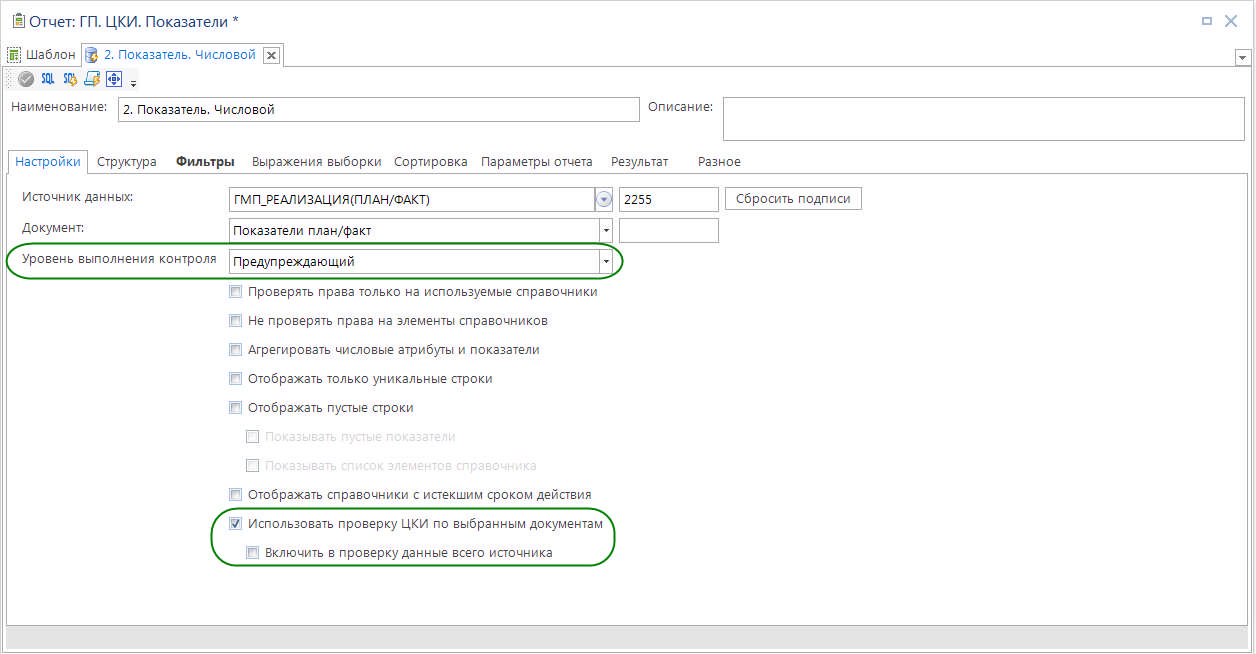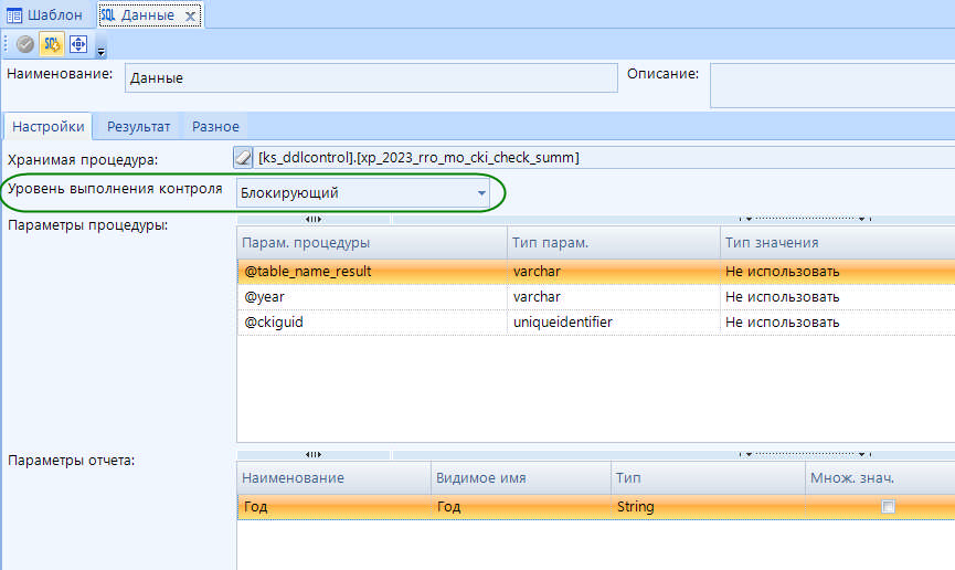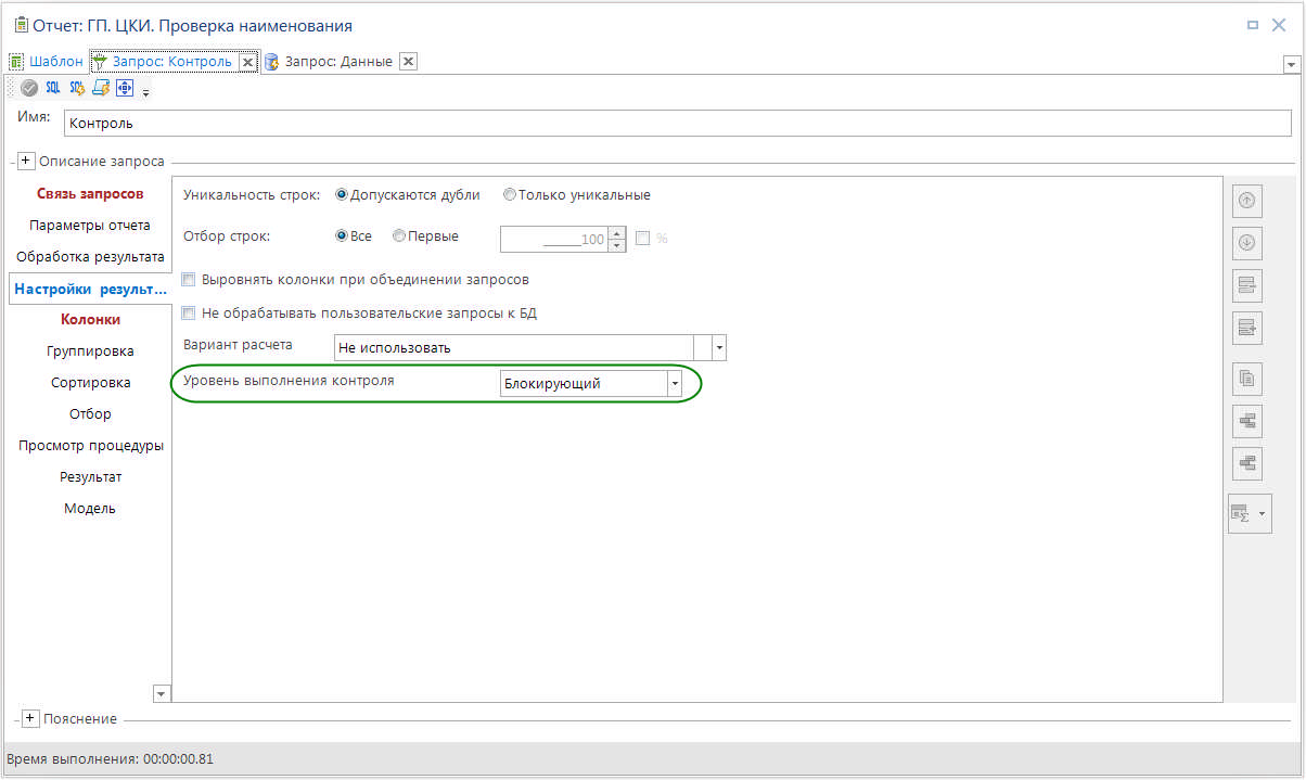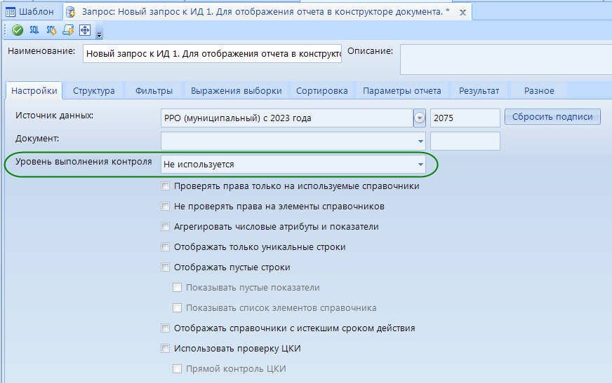 Запрос к БД, то во вкладке Настройки необходимо включить настройку Уровень выполнения контроля.