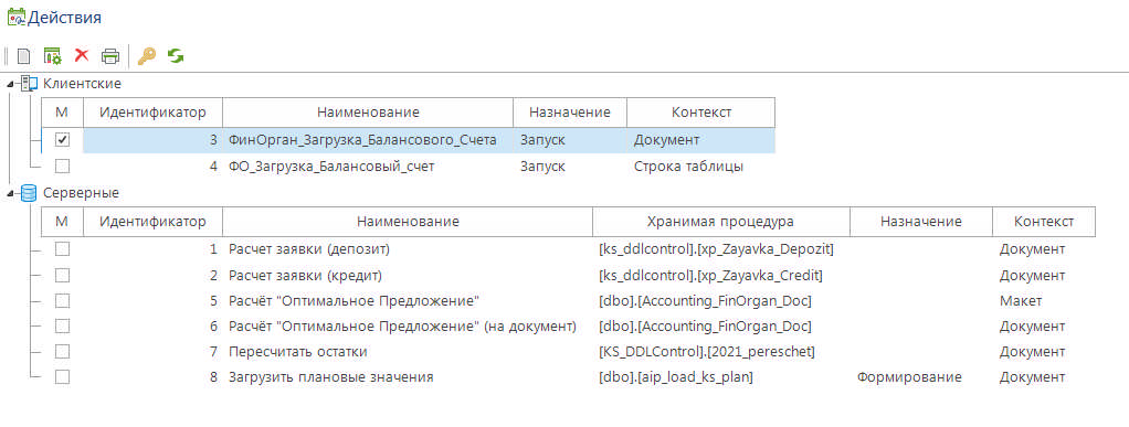 Переход к режиму Действия программного комплекса осуществляется по кнопке Действия (ярлык может иметь вид , зависит от стиля, выбранного в настройках программного комплекса) главной панели инструментов. Данный режим позволяет настроить запуск какого-либо действия (хранимой процедуры, пересчета выражений, загрузки данных и тд) из различных режимов комплекса: документа, отчетной формы, макета ИД, на этапе прохождения БП и далее.