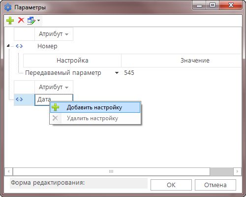 Добавить атрибут — Добавить поле для настройки передаваемого параметра. Далее для создания настроек необходимо воспользоваться контекстным меню атрибута.