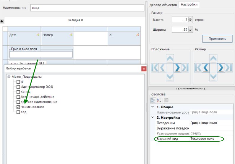 Текстовое поле — для использования связанной таблицы в виде текстового поля необходимо, чтобы в структуру данной таблицы был добавлен только один справочник. Для выбора отображаемого значения справочника необходимо дважды кликнуть по уровню и в открывшемся окне выбрать атрибут справочника, установив флажок. При просмотре документа в случае выбора нескольких элементов справочника значения будут перечислены через точку с запятой.
