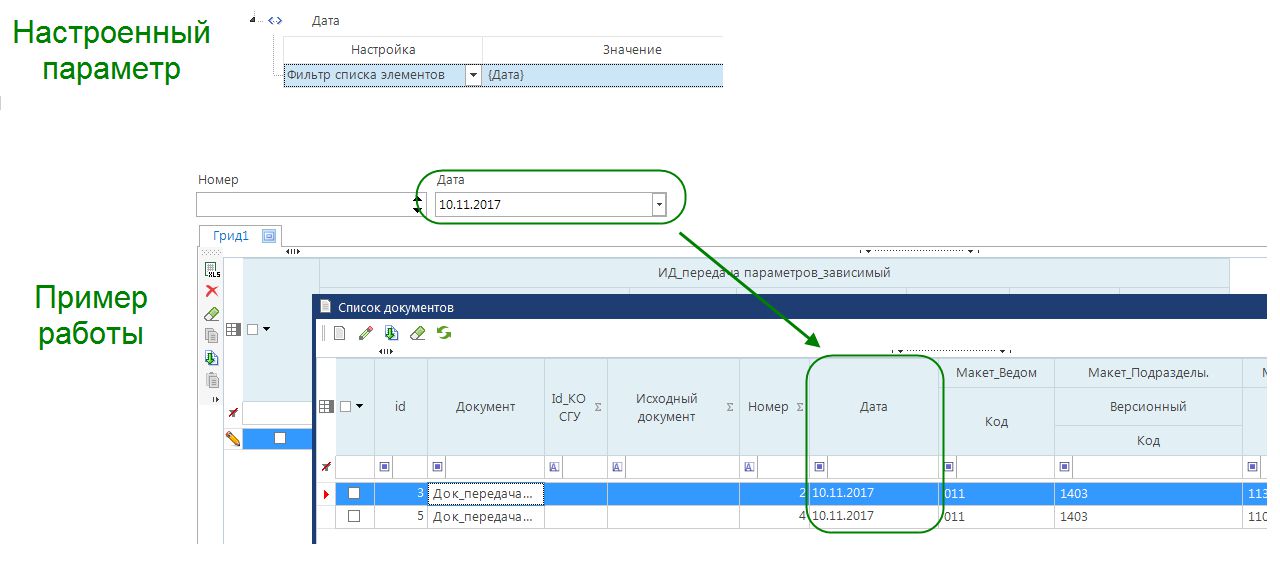 Фильтр списка элементов — при открытии связанного ИД и его списка документов, данный список будет отфильтрован по установленному параметру.