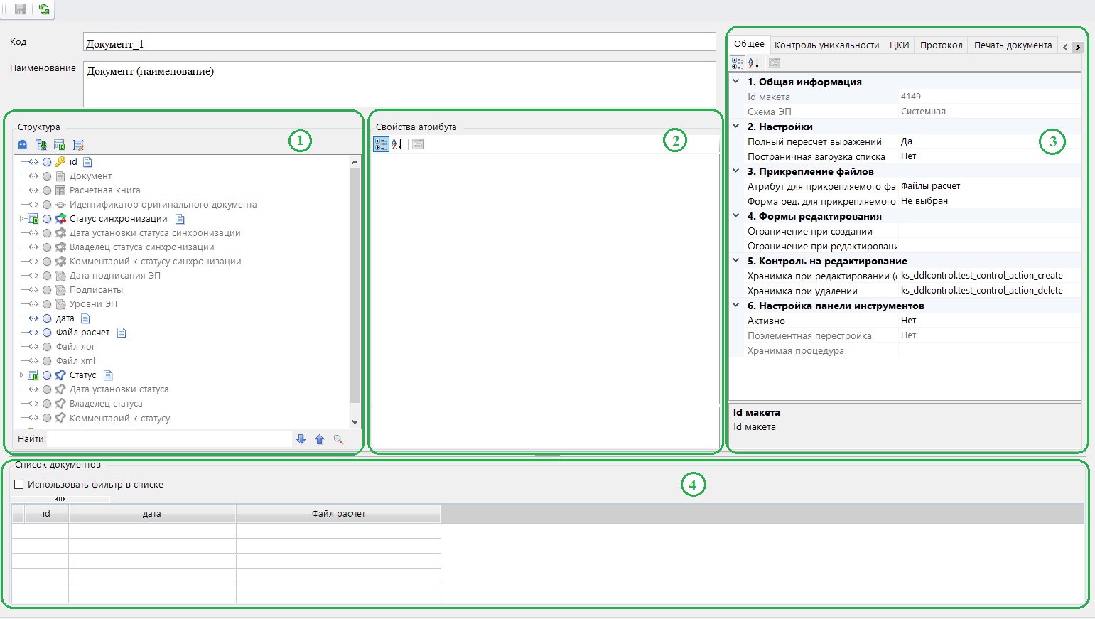 - область Общие настройки документа (3) - содержит настройки, используемые для документа в целом, распределенные по вкладкам: Общее, Контроль уникальности, ЦКИ, Протокол, Печать документа, Управление блокировками, Действия, Мнимый атрибут