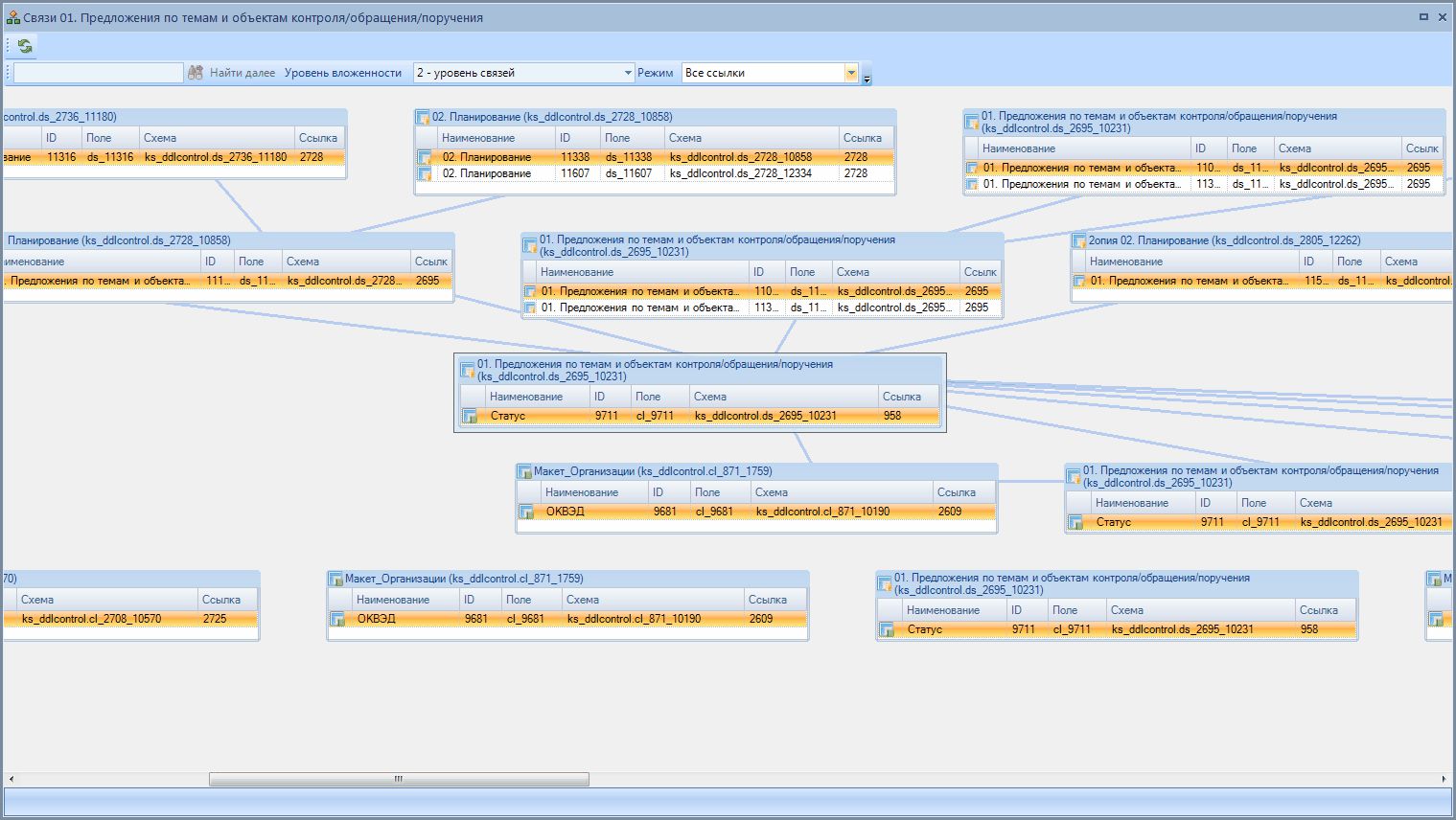 При просмотре зависимостей макета ИД по кнопке clip0145 панели инструментов отображаются все связи макета ИД выбранного уровня вложенности и режима.