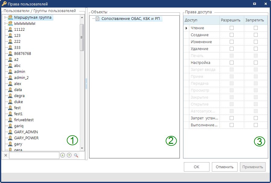 Окно настройки прав пользователей состоит из списка пользователей/групп пользователей (1), списка объектов (2) и меню прав комплекса (3).