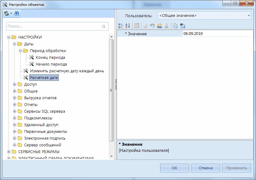 В настройке Расчетная дата указывается значение расчетной даты комплекса.
