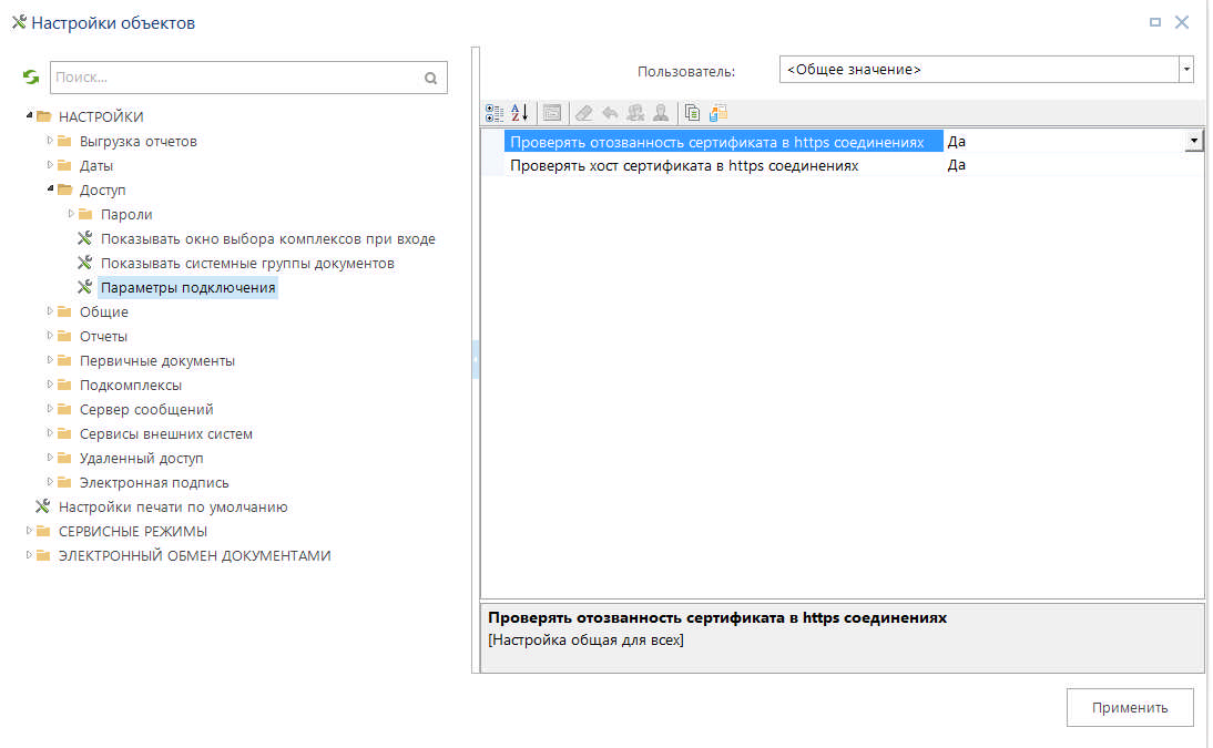 - Проверять отозванность сертификата в https соединениях - если стоит значение Да, то настройка включена. В этом случае при установке SSL/TSL соединений проверяется отозванность сертификата. При невозможности проверки выходит ошибка "Невозможно проверить функцию отзыва, т.к. сервер отзыва сертификатов недоступен". При особенностях конфигурации сетевого окружения, когда такая проверка невозможна, настройку следует исключить - установить значение Нет.
