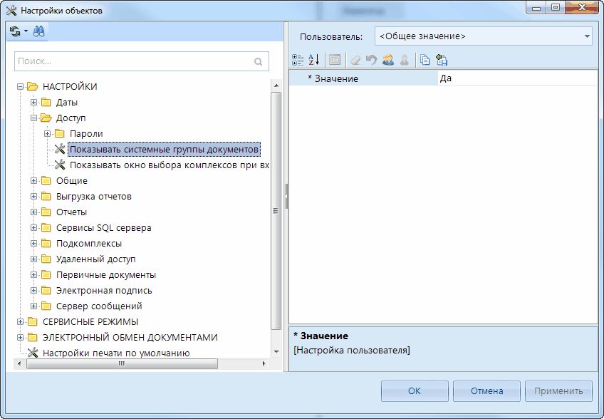 - Показывать системные группы документов - позволяет скрыть системные пункты навигатора, т.е. все режимы, которые присутствуют в программе по умолчанию. При значении "Нет" пользователь будет видеть только АРМы и Личный каталог.
