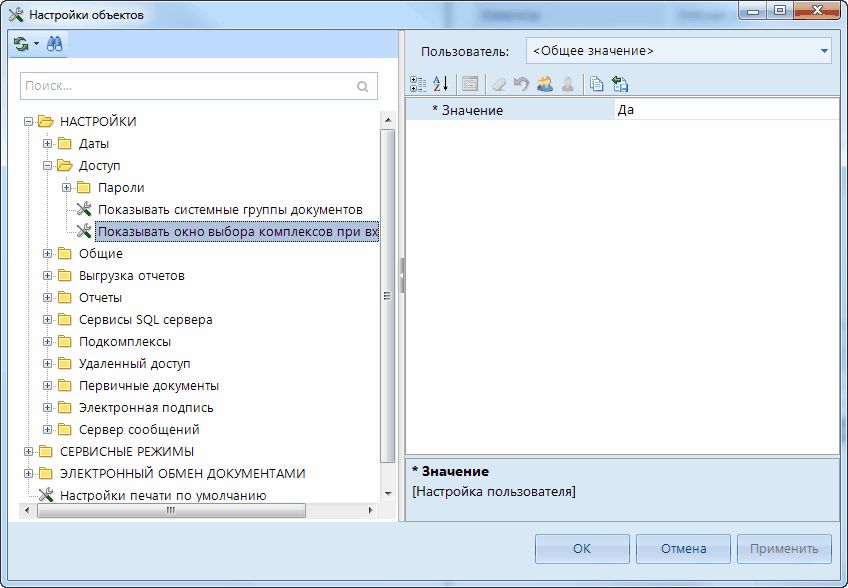 - Показывать окно выбора комплексов при входе - задает возможность выбора комплекса для работы в текущем сеансе, в случае если пользователю даны права на несколько подсистем.