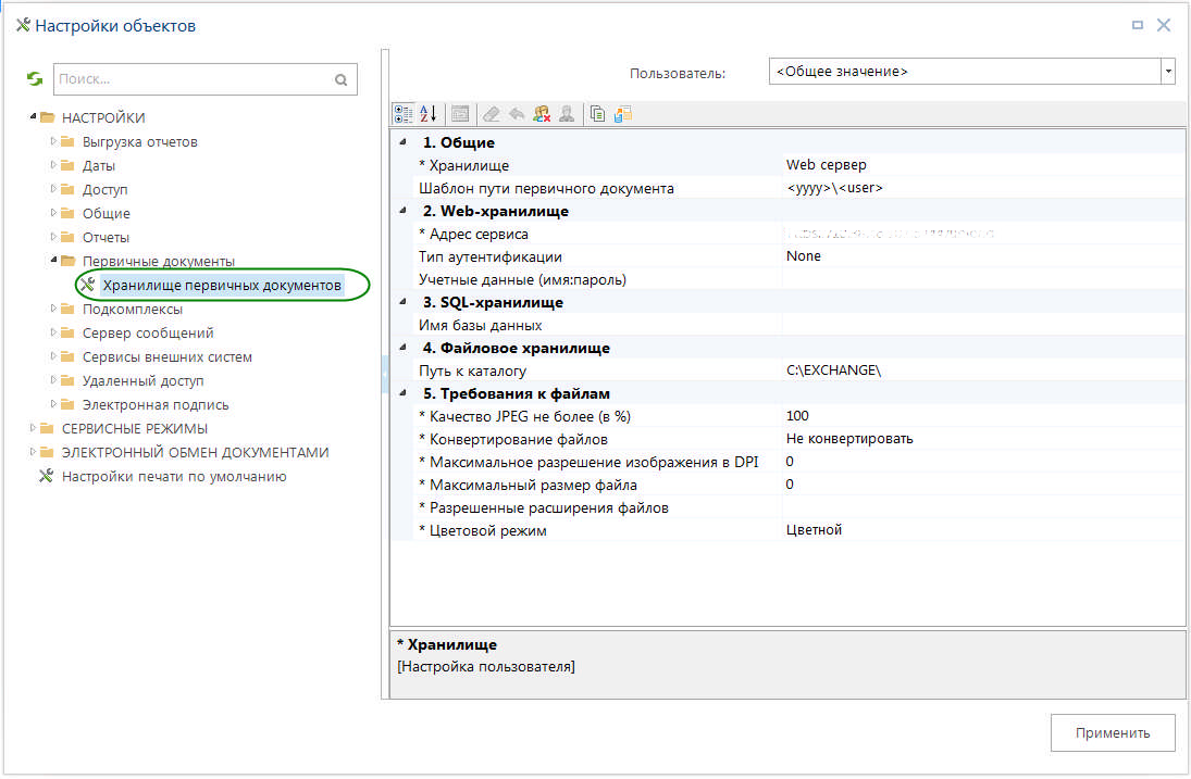 Группа настроек, определяющих месторасположение хранилища для первичных документов, прилагаемых к документам комплекса (сканы, текстовые документы и т.д.) , в т.ч. при электронном приеме, а так же для хранения отчетов и произвольных документов.