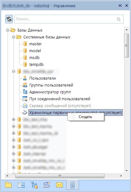 Для настройки файлового хранилища первичных документов также необходимо создать Хранилище первичных документов. Для этого надо зайти в Сервис -> Управление базами данных (см. раздел Управление базами данных). Далее найти нужную базу, выбрать пункт Хранилище первичных документах и создать его с помощью контекстного меню.