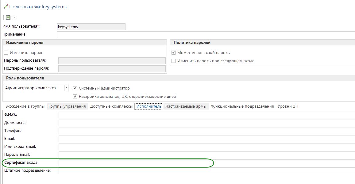 в режиме меню "Настройки - Пользователи", на вкладке "Исполнитель" в поле "Сертификат входа" указывается серийный номер сертификата (например #1234567890 ).