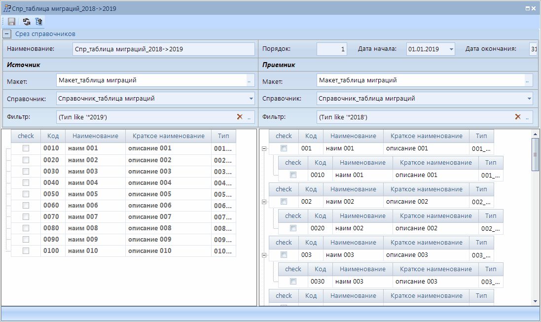 Во вкладке Приемник отображаются все элементы выбранного справочника с учетом установленного фильтра: