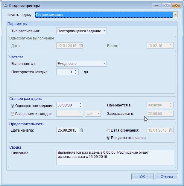В окне создания и редактирования задачи планировщика необходимо указать: