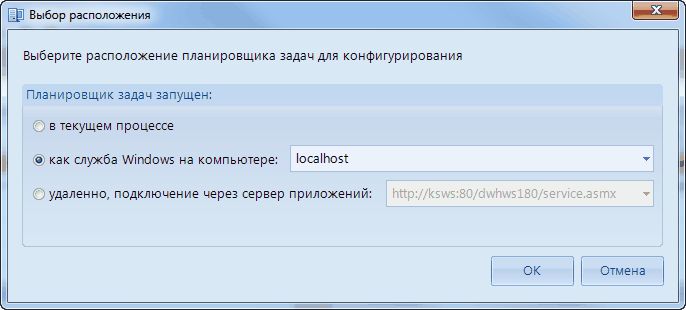 Планировщик может быть запущен/настроен локально либо удаленно - для выбора настраиваемого планировщика используется кнопка Выбрать расположение планировщика: