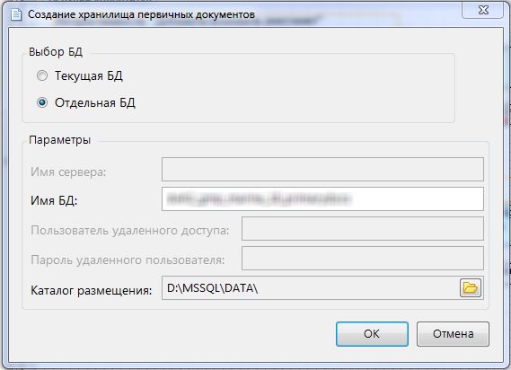 - Далее заходим в самой базе в Меню Настройки: НАСТРОЙКИ \ Первичные документы \ Хранилище первичных документов (см. раздел Хранилище первичных документов). В пункте Хранилище необходимо выбрать значение SQL сервер, название базы для файлов проставляется автоматически.