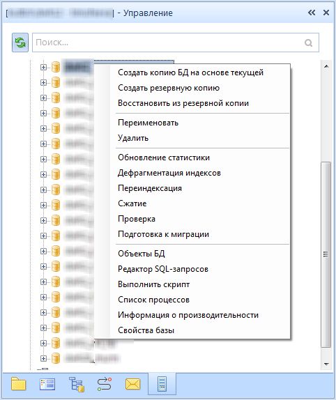 - Удалить - удаление текущей базы без возможности восстановления (физически удаляются файлы базы на дисках компьютера).