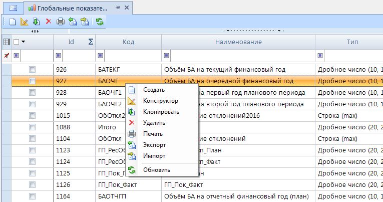 Также данные действия можно выполнить с помощью контекстного меню списка показателей.