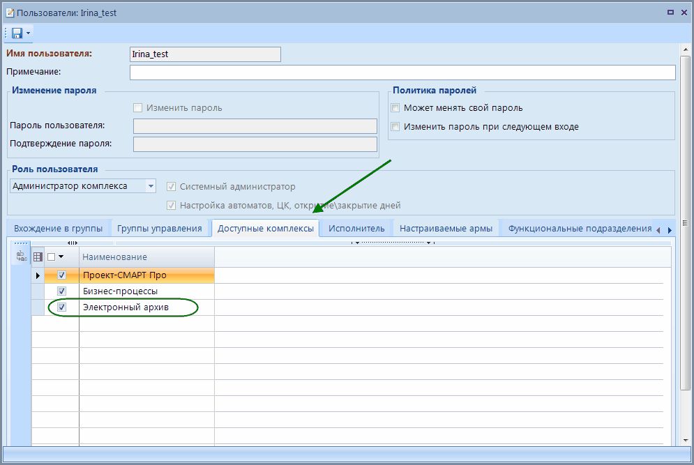 - В режиме настроек пользователя во вкладке Доступные комплексы необходимо включить опцию Электронный архив. И сохранить внесенные изменения по кнопке