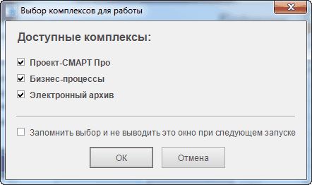 - Далее необходимо перезайти в комплекс. После окна регистрации пользователя отобразится окно Выбор комплексов для работы. В данном окне необходимо включить опцию Электронный архив и нажать ОК.
