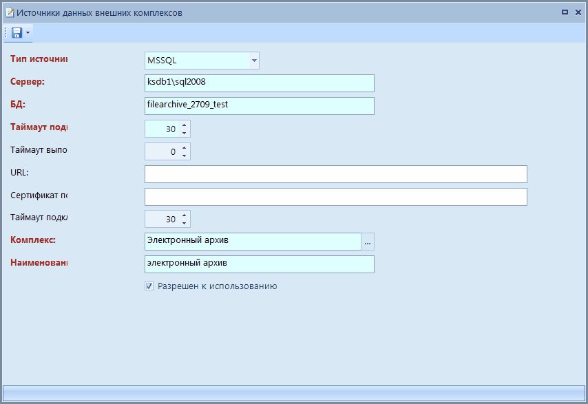 - Перейти из навигатора комплекса в справочник Источники данных внешних комплексов (подробнее описано в п.Прочие). Далее создать новый элемент, в котором необходимо прописать параметры подключения к базе электронного архива.