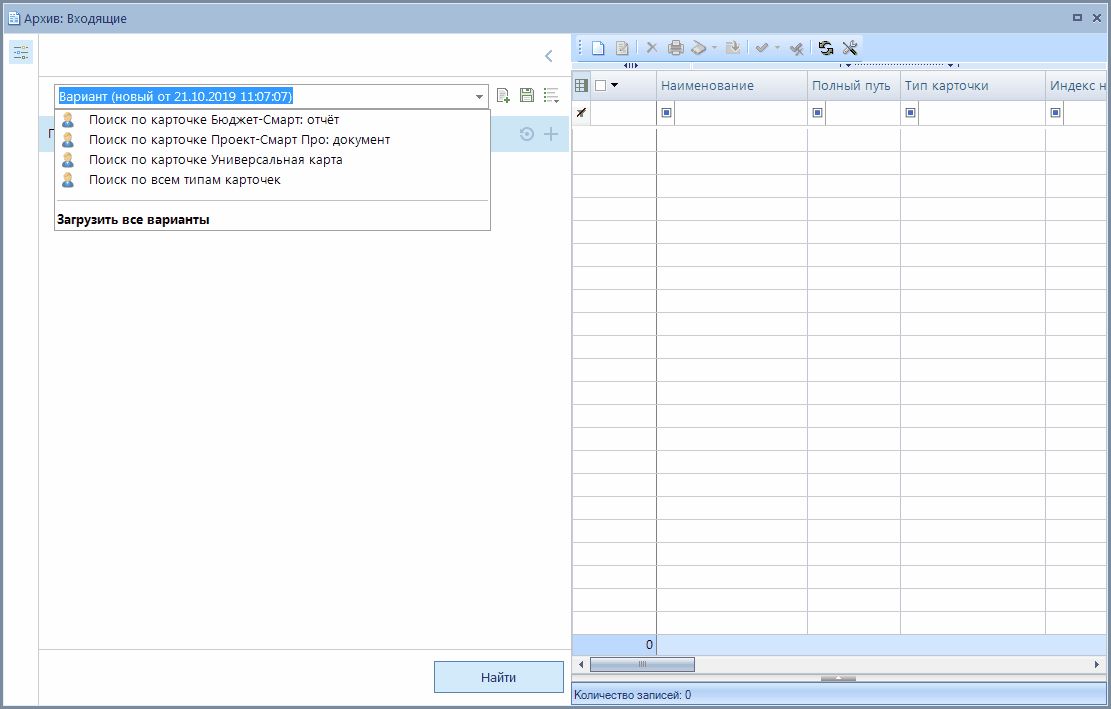 После открытия соответствующей папки электронного архива в раскрывающемся списке необходимо выбрать значение Поиск по карточке ПК: документы и нажать Найти.