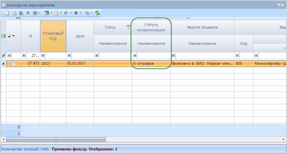 Установить статус синхронизации панели инструментов устанавливаем начальный статус - К отправке.