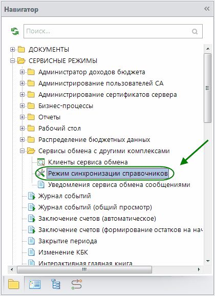 Через Навигатор открываем форму настройки режима синхронизации справочников (Сервисные режимы – Сервисы обмена с другими комплексами – Режим синхронизации справочников).
