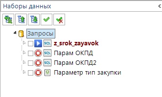 Переход к списку запросов отчета осуществляется при выборе вкладки Наборы данных панели навигации конструктора шаблона отчета. Выбор типа запроса определяется на этапе проектирования.