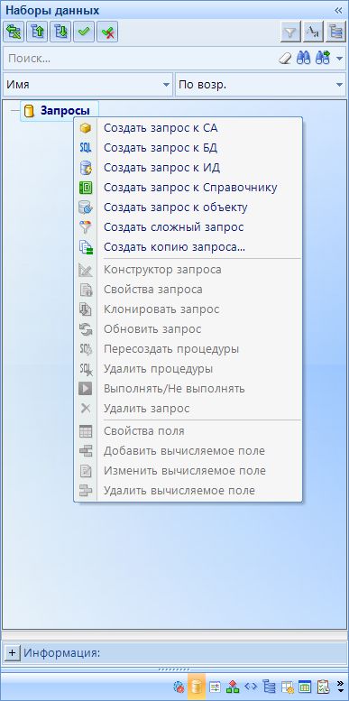 Создать запрос к ИД - создание запроса к источнику данных. Подробнее см. в разделе Запрос к ИД.