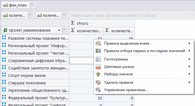 Переход к форматированию, сортировке и настройке фильтров в сводной таблице осуществляется с помощью контекстного меню поля.