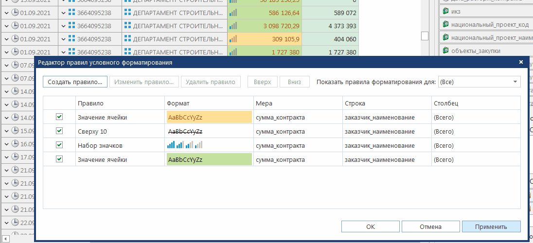 Правила отбора первых и последних значений - отформатировать поля по заданному условию цветом/курсивом.