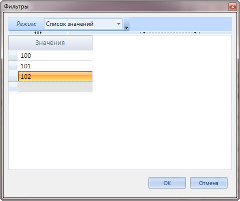 Для связанных справочников режим Список значений представляет собой список элементов связанного справочника, где фильтрация происходит вручную, путём постановки галочки в столбцах Вкл.\Искл.: