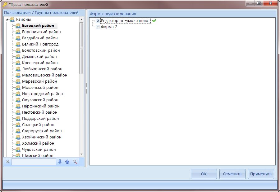 Открывшаяся форма позволяет настроить права доступа к формам редактирования справочника для пользователей\групп пользователей, а именно необходимо выбрать пользователя\группу пользователей и проставить галочку рядом с формой редактирования, на которую необходимо дать доступ.